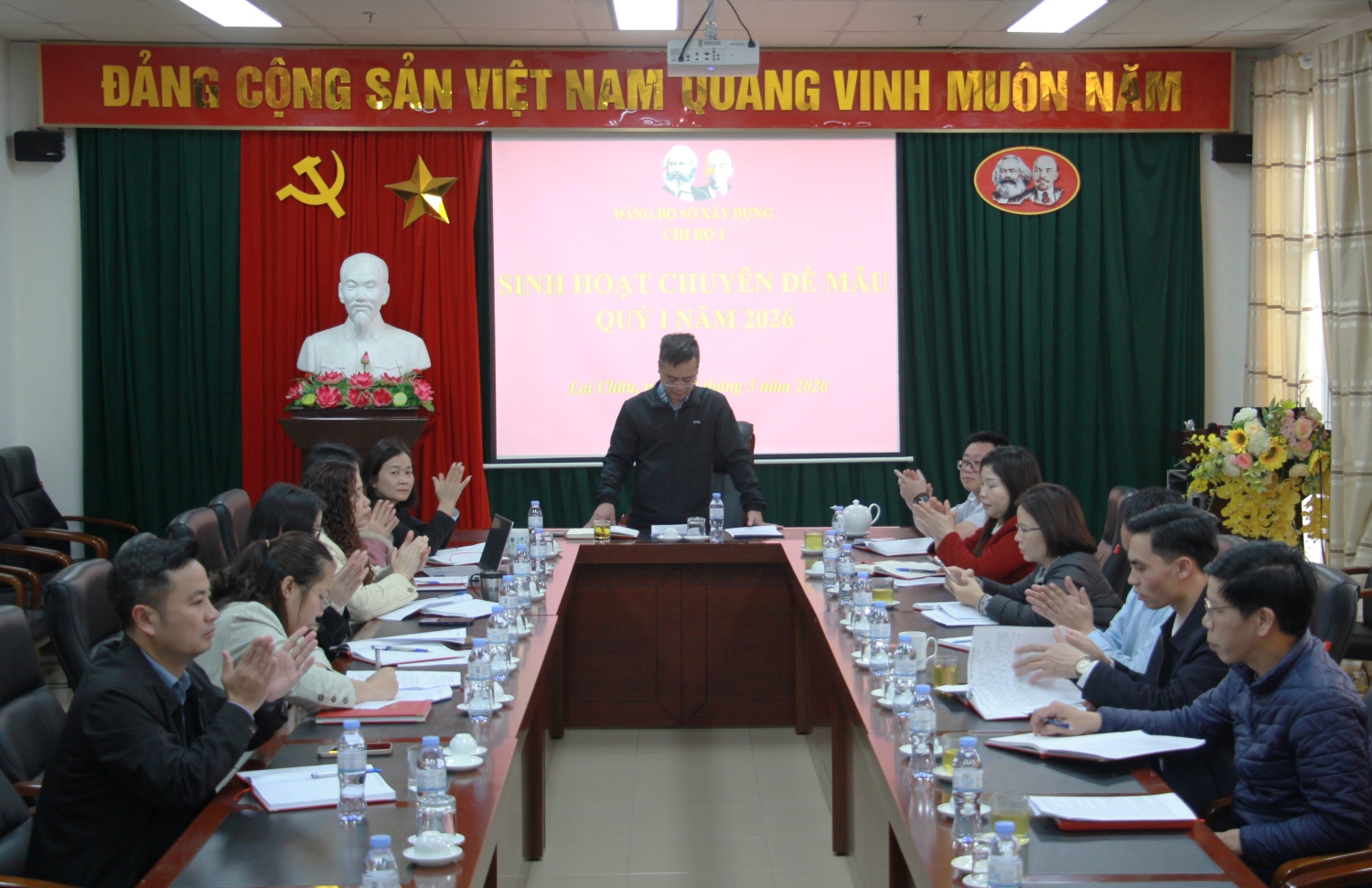 Thực hiện Kế hoạch số 21-KH/ĐU ngày 19/01/2026 của Đảng ủy Sở Xây dựng về tổ chức sinh hoạt chi bộ mẫu năm 2026, chiều ngày 13/3/2026, Chi bộ 1 thuộc Đảng bộ Sở Xây dựng tổ chức sinh hoạt chuyên đề mẫu Quý I năm 2026 với chủ đề: “Giải pháp nâng cao tỷ lệ hồ sơ nộp trực tuyến trong giải quyết thủ tục hành chính tại Sở Xây dựng tỉnh Lai Châu”. Hội nghị do đồng chí Nguyễn Hải Trung - Bí thư Chi bộ chủ trì. Đến dự Hội nghị có đồng chí Trịnh Quang Anh - Phó Bí thư Đảng ủy Sở Xây dựng; các đồng chí Ủy viên Ban Chấp hành Đảng bộ Sở; cấp ủy các chi bộ trực thuộc Đảng bộ Sở cùng toàn thể đảng viên, quần chúng thuộc Chi bộ 1.